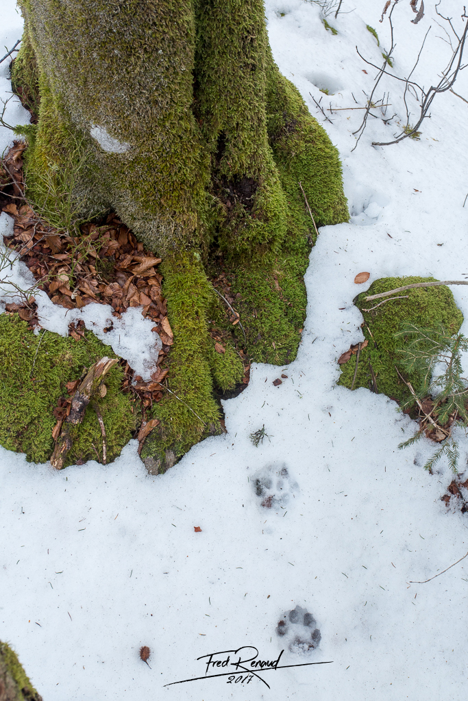 Le lendemain, retour sur ses traces pour découvrir son parcours, et réaliser qu’il était passé vraiment tout près, et surtout avait passé un long moment devant un autre point d’affût…